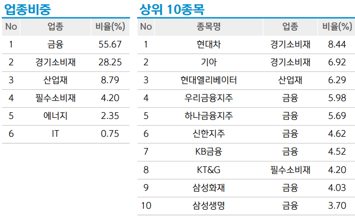 - 구성: 4대 금융지주(KB, 신한, 하나, 우리)를 필두로 자동차, 통신 등 배당 성장성이 높은 우량주 위주로 구성됩니다.