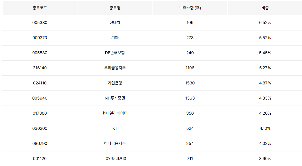 - 구성: 금융주(은행, 보험) 비중이 높지만, 현대차, 기아 등 배당 여력이 큰 대형 가치주도 균형 있게 담고 있습니다.